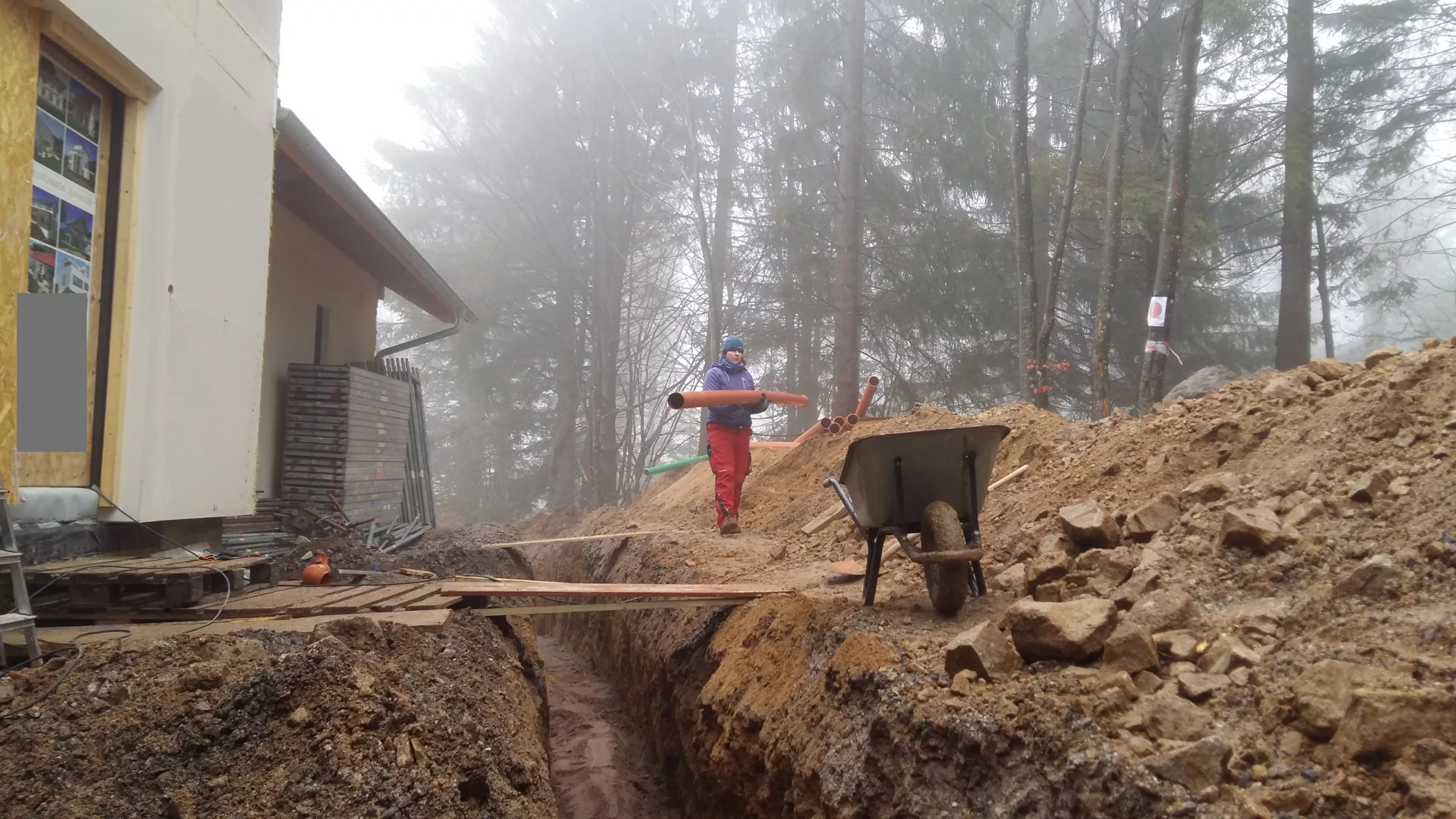 We had used excavators before, we had moved tons and tons of material on the driveway with it. But we were afraid, like all normal new homeowners, that we would do a mistake on this so very important step of the construction, because (of course) we never did anything like this before. Mathias knew someone who had done it: he was a handyman he knew his whole life. Naturally, we asked him how much it would cost us. He told us that a total of 2.000 Euros and a week would be enough. Without any options, pressed by building deadlines and running low on money, we took the offer, believing that because we knew him, the deal was safe. Oh, what a mistake!